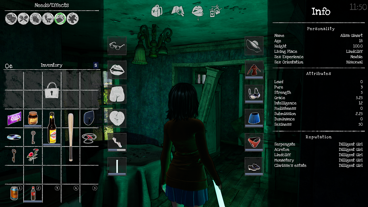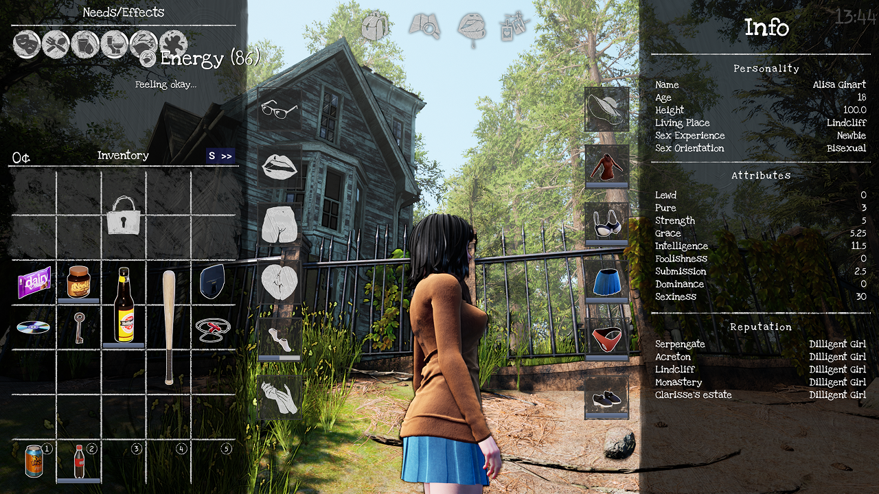 - Clothes and accessories system (changing, wearing multiple layers, effects and NPCs’ reactions)